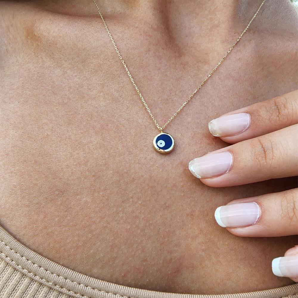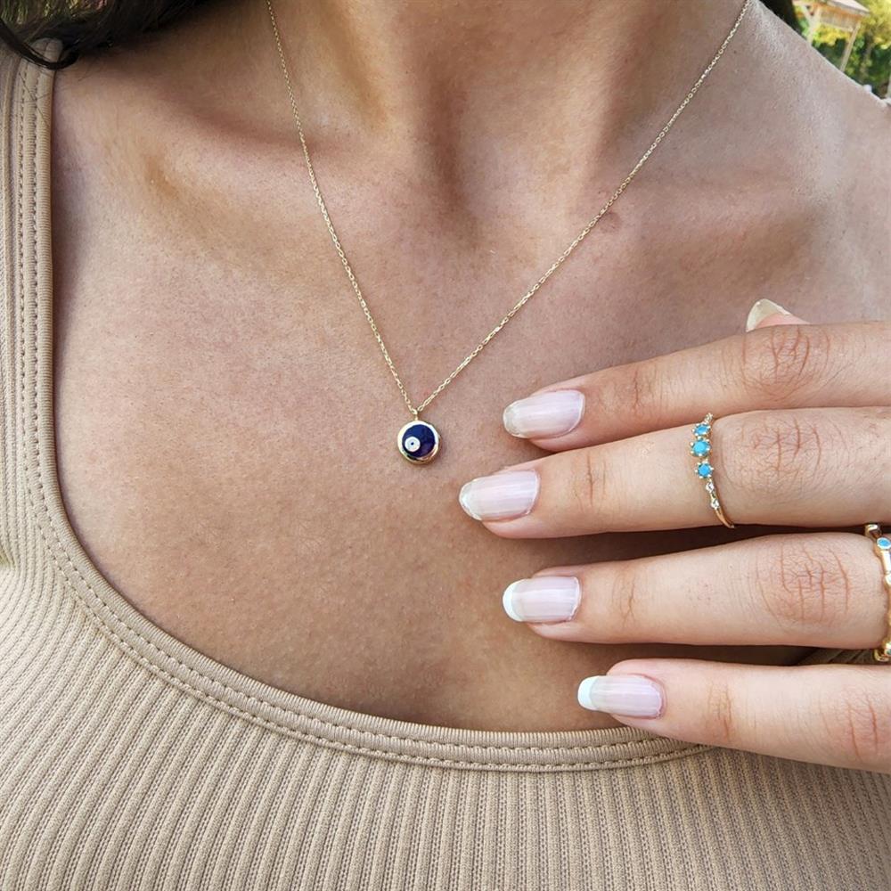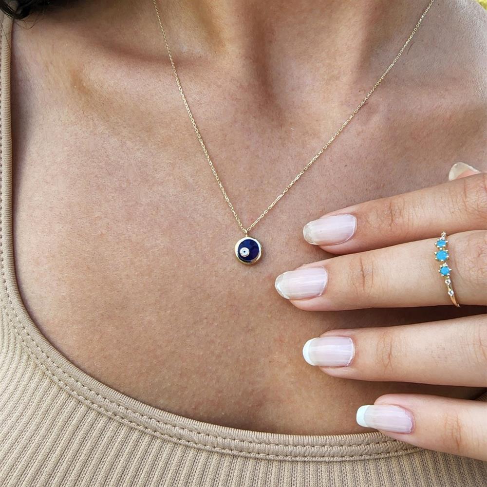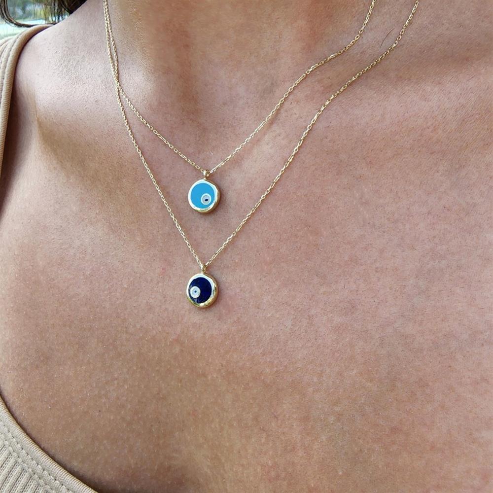 Ala Lacivert Lazer Mineli Nazar Boncuğu Göz Tasarım Taşsız Modern Hediye Tarz 14 Ayar Altın Kolye