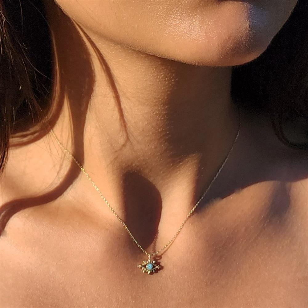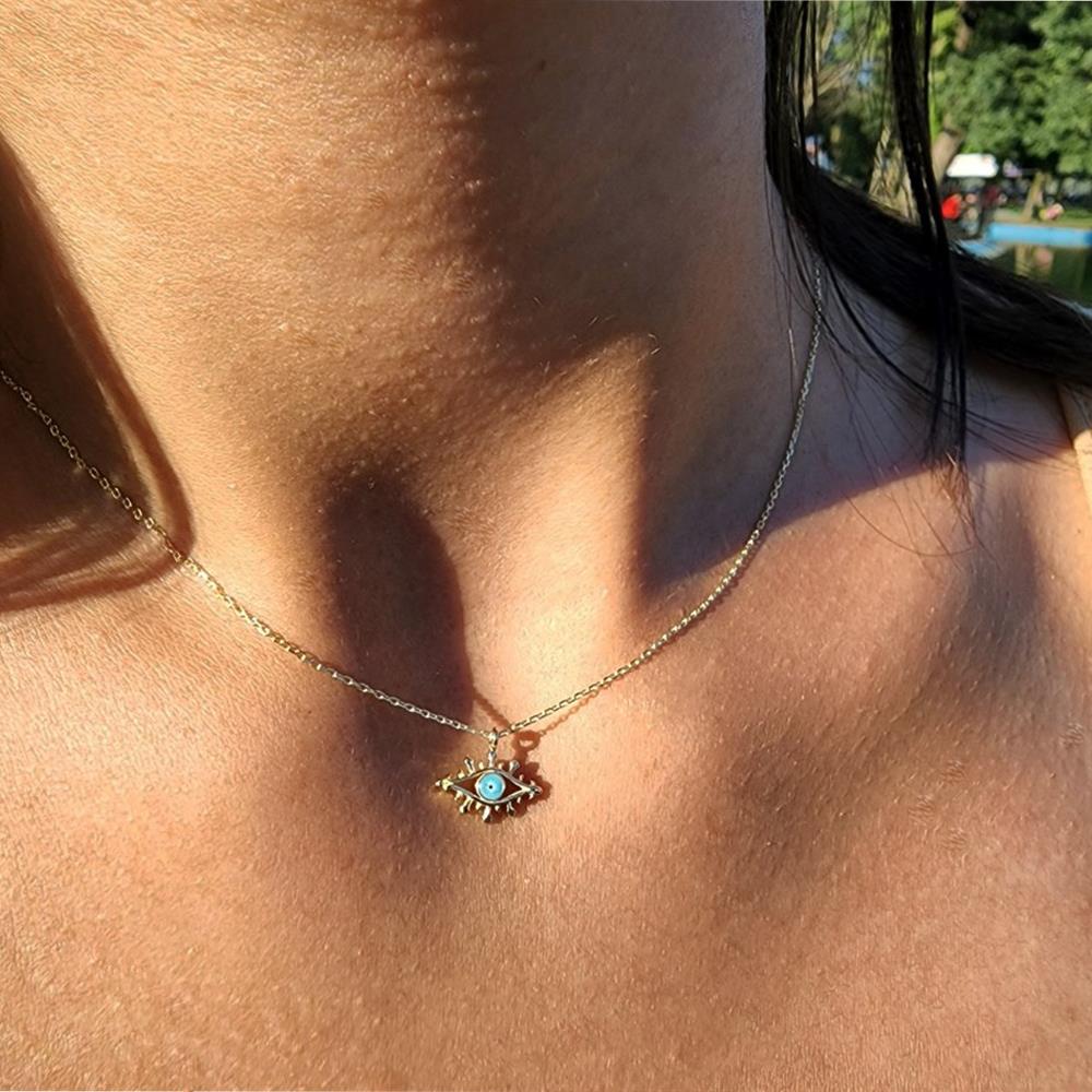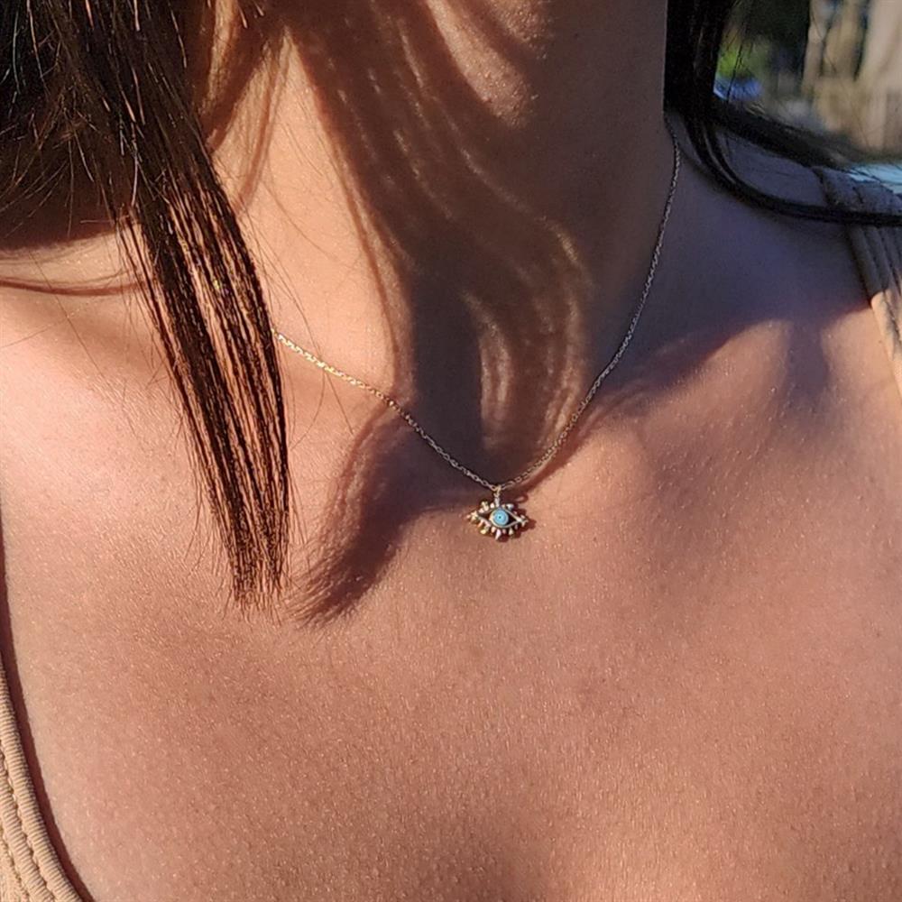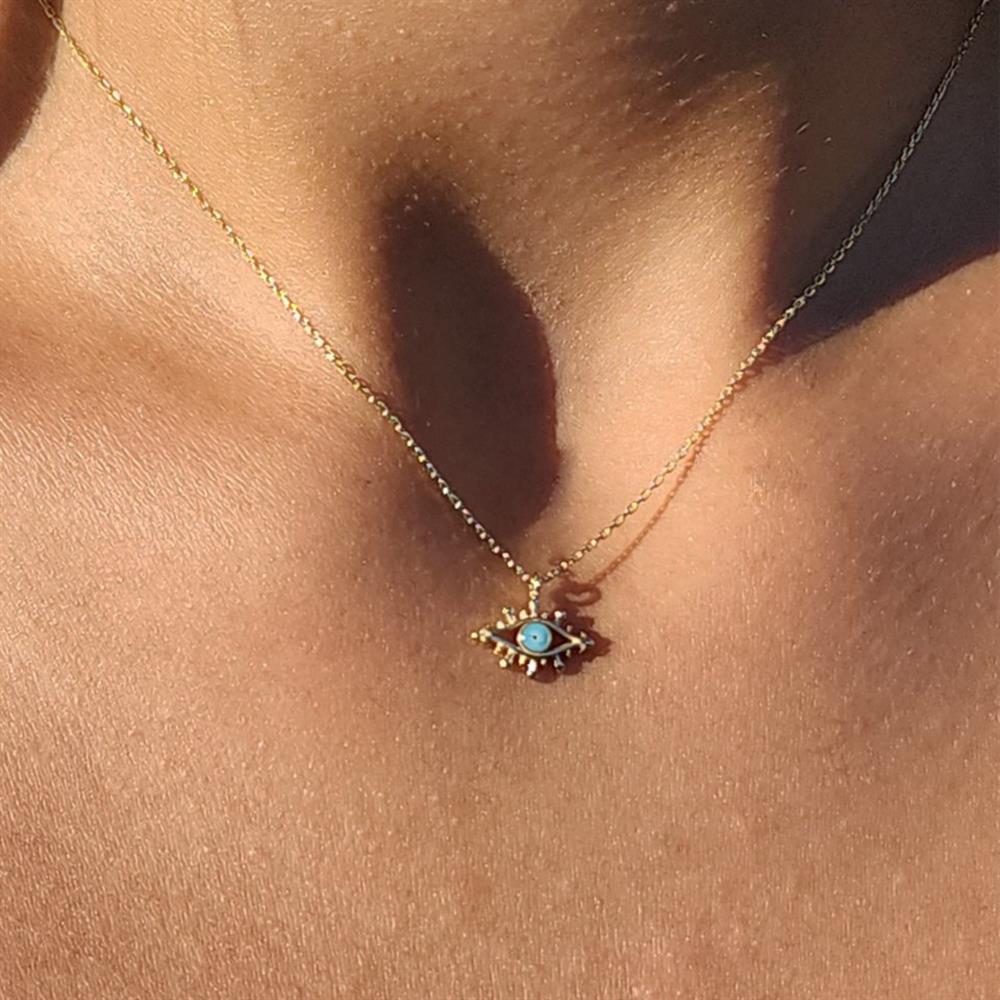 Tasarım Kirpik Nazar Boncuğu Firuze Mineli Göz Tasarım Stil Modern 14 Ayar Altın Kolye- Altın Kolye